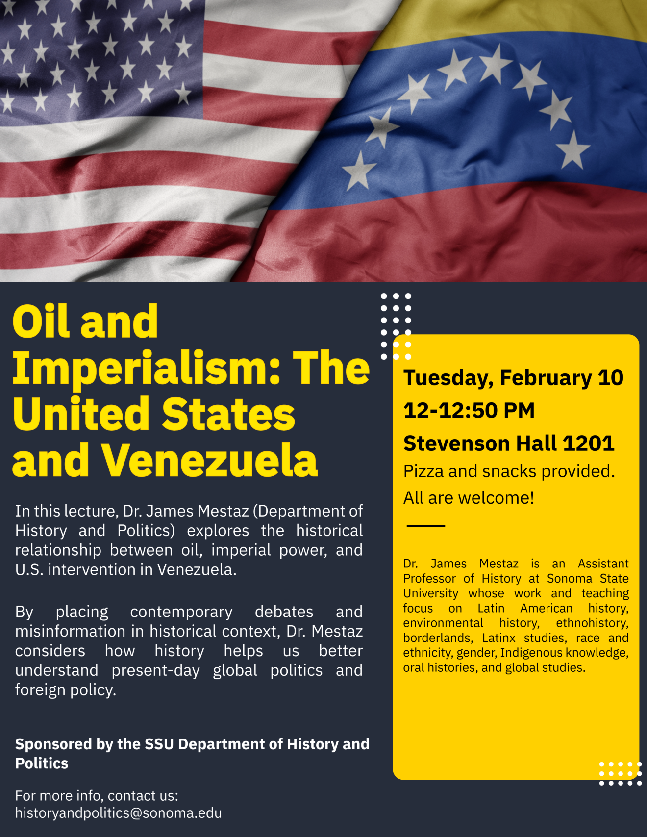 Save the date: Oil and Imperialism: The United States and Venezuela Tuesday, February 10 12-12:50 PM, Stevenson Hall 1201